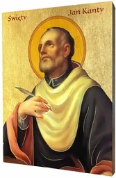 Ikona religijna święty Jan KantyIkona religijna świętego Jana Kantego wykonana na desce lipowej, podwójnie gruntowanej oraz uszlachetnionej płatkami pozłoty. Wizerunek świętego Jana Kantego został naniesiony przy użyciu specjalnej techniki druku bezpośrednio na deskę. Jan z Kęt przekazywał wiedzę zaczerpniętą z najczystszego źródła". Zasłynął również z wielkiego miłosierdzia. Nie mogąc inaczej zaradzić ludzkiej nędzy, wyzbywał się własnego odzienia i obuwia, a swoją pracą pisarza-kopisty pomagał umiłowanej braci studenckiej.