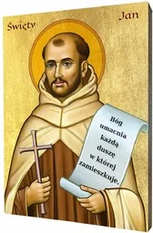 Ikona religijna święty Jan od KrzyżaIkona religijna świętego Jana od Krzyża wykonana na desce lipowej, podwójnie gruntowanej oraz uszlachetnionej płatkami pozłoty. Wizerunek świętego Jana od Krzyża został naniesiony przy użyciu specjalnej techniki druku bezpośrednio na deskę. Święty Jan od Krzyża był reformatorem zakonu karmelitów. Jest uważany, wraz z Teresą z Ávili, za założyciela karmelitów bosych. Jest również znany ze swych dzieł literackich.