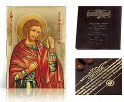 Święty Sebastian gdy tylko wyzdrowiał natychmiast udał się do cesarza ponownie oskarżając go o niesprawiedliwe traktowanie chrześcijan, wtedy Dioklecjan zlecił, aby zatłuc go pałkami- a jego ciało wrzucić do Cloaca Maxima. Symbolika: Na ikonie Święty Sebastian trzyma strzały, które go ugodziły. Ikona religijna dostępna w siedmiu rozmiarach 10x12cm, 10,5x14cm, 12x16cm, 17x23cm, 29x39cm, 50x70cm oraz 70x100cm. Wizerunek bardzo wyrazisty i trwały, naniesiony na ręcznie złoconą deskę drewnianą. Możliwość wygrawerowania dowolnej treści na odwrocie ikony.