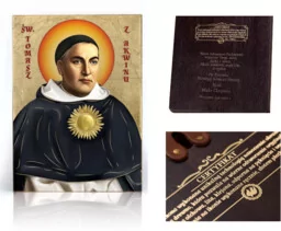 Ikona religijna Święty Tomasz z Akwinu Na prezentowanej ikonie religijnej znajduje się wizerunek Świętego Tomasza z Akwinu - najwybitniejszego myśliciela chrześcijaństwa, patrona szkół katolickich. Ikona religijna dostępna w siedmiu rozmiarach 10x12cm, 10,5x14cm, 12x16cm, 17x23cm, 29x39cm, 50x70cm oraz 70x100cm. Wizerunek bardzo wyrazisty i trwały, naniesiony na ręcznie złoconą deskę drewnianą. Możliwość wygrawerowania dowolnej treści na odwrocie ikony. Informujemy, że niejednolity odcień oraz nieregularna powierzchnia złocenia są zjawiskiem naturalnym ze względu na właściwość materiału oraz ręczne wykonanie.