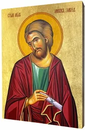 Ikona św. Jakub ApostołIkona z wizerunkiem św. Jakuba Apostoła wykonana na desce lipowej, podwójnie gruntowanej oraz uszlachetnionej płatkami pozłoty. Wizerunek św. Jakuba został naniesiony przy użyciu specjalnej techniki druku bezpośrednio na deskę. Ikona z tyłu posiada certyfikat naszej firmy wraz z rokiem produkcji oraz zawieszkę typu krokodyl i jest gotowa do zawieszenia; dostępna jest w pięciu rozmiarach; grafika dostosowywana jest do formatu deski przez co może nieznacznie różnić się od zdjęcia produktu: