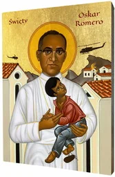 Ikona św. Oskar Romero, biskup i męczennikIkona św. Oskara Romero wykonana na desce lipowej, podwójnie gruntowanej oraz uszlachetnionej płatkami pozłoty. Grafika ikony św. Oskara Romero został naniesiony przy użyciu specjalnej techniki druku bezpośrednio na deskę. Oskar Arnulf Romero Galdámez urodził się 15 sierpnia 1917 w Ciudad Barrios (departament San Miguel w południowo-wschodnim Salwadorze).
