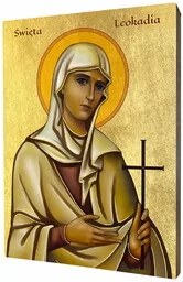 W samym Toledo ku jej czci biskup św. Heladiusz dedykował jej bazylikę, w której spoczywały jej relikwie. W tej to właśnie bazylice odbywały się słynne toledańskie synody kościelne w latach 633, 636, 638 i 694, co z pewnością przyczyniło się do rozszerzenia kultu św. Leokadii. Ikona z tyłu posiada certyfikat naszej firmy wraz z rokiem produkcji oraz zawieszkę i jest gotowa do zawieszenia; dostępna jest w pięciu rozmiarach; grafika dostosowywana jest do formatu deski przez co może nieznacznie różnić się od zdjęcia produktu: 10x15 cm15x20 cm20x25 cm30x40 cm40x50 cmIkony religijne ART CHRISTIANA - wspaniały upominek religijnyNie stosujemy produkcji masowej.