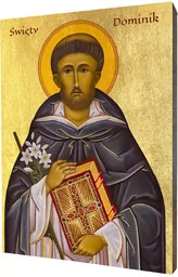Ikona świętego DominikaIkona świętego Dominika wykonana na desce lipowej, podwójnie gruntowanej oraz uszlachetnionej płatkami pozłoty. Wizerunek św. Dominika został naniesiony przy użyciu specjalnej techniki druku bezpośrednio na deskę. Ikona z tyłu posiada certyfikat naszej firmy wraz z rokiem produkcji oraz zawieszkę typu krokodyl i jest gotowa do zawieszenia; dostępna jest w pięciu rozmiarach; grafika dostosowywana jest do formatu deski przez co może nieznacznie różnić się od zdjęcia produktu: 10x15 cm15x20 cm20x25 cm30x40 cm40x50 cmNie stosujemy produkcji masowej.