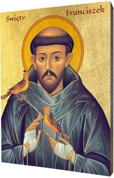 Ikona świętego Franciszka z AsyżuIkona świętego Franciszka z Asyżu wykonana na desce lipowej, podwójnie gruntowanej oraz uszlachetnionej płatkami pozłoty. Wizerunek na ikonę świętego Franciszka został naniesiony przy użyciu specjalnej techniki druku bezpośrednio na deskę. Święty Franciszek z AsyżuFranciszek z Asyżu (właśc. wł. Giovanni di Pietro di Bernardone, nazywany Biedaczyną z Asyżu; ur. 1181 lub 1182 w Asyżu, zm. 3 października 1226 w Porcjunkuli koło Asyżu) założyciel zakonu franciszkanów, a pośrednio także klarysek i tercjarzy, misjonarz, mistyk średniowieczny, stygmatyk, święty Kościoła katolickiego, uważany za patrona ekologii. "Prawie do 25 roku życia wraz z rówieśnikami brnął w próżności, a w pogoni za próżną chwałą, nie dał się nikomu prześcignąć, w żartach, w krotochwilach, w piosenkach, w pięknych strojach". Walczył w wojnie między Perugią a Asyżem gdzie trafił do niewoli w1202r.