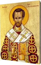 Ikona świętego Jana ChryzostomaIkona świętego Jana Chryzostoma wykonana na desce lipowej, podwójnie gruntowanej oraz uszlachetnionej płatkami pozłoty. Wizerunek świętego Jana Chryzostoma został naniesiony przy użyciu specjalnej techniki druku bezpośrednio na deskę. Ikona z tyłu posiada certyfikat naszej firmy wraz z rokiem produkcji oraz zawieszkę typu krokodyl i jest gotowa do zawieszenia; dostępna jest w pięciu rozmiarach; grafika dostosowywana jest do formatu deski przez co może nieznacznie różnić się od zdjęcia produktu: 10x15 cm15x20 cm20x25 cm30x40 cm40x50 cmNie stosujemy produkcji masowej. Ikony powstają w chwili złożenia zamówienia, a każdego Klienta traktujemy indywidualnie.