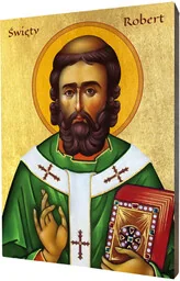 Ikona świętego Roberta z SalzburgaIkona świętego Roberta z Salzburga wykonana na desce lipowej, podwójnie gruntowanej oraz uszlachetnionej płatkami pozłoty. Wizerunek św. Roberta został naniesiony przy użyciu specjalnej techniki druku bezpośrednio na deskę. Św. Robert z SalzburgaRobert z Salzburga święty Kościoła katolickiego i wschodnio-ortodoksyjnego, biskup misyjny Nadrenii, pierwszy biskup Salzburga w Austrii, uważany również za założyciela miasta oraz patron regionu Salzburgland. Pochodził prawdopodobnie z rodziny arystokratycznej Robertynerów.