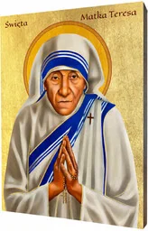 Ikona świętej Matki Teresy z KalkutyIkona świętej Matki Teresy z Kalkuty wykonana na desce lipowej, podwójnie gruntowanej oraz uszlachetnionej płatkami pozłoty. Wizerunek na ikonę świętej Matki Teresy z Kalkuty został naniesiony przy użyciu specjalnej techniki druku bezpośrednio na deskę. Święta Matka TeresaMatka Teresa z Kalkuty MC, właśc. Agnes Gonxha Bojaxhiu (ur. 26 sierpnia 1910 w Skopje w Imperium Osmańskim, zm. 5 września 1997 w Kalkucie w Indiach) albańska zakonnica, założycielka zgromadzenia Misjonarek Miłości, laureatka Nagrody Templetona oraz Pokojowej Nagrody Nobla w roku 1979, święta Kościoła katolickiego. Od 1948 do śmierci w 1997 prowadziła hospicja dla umierających, ubogich, chorych i sierot.