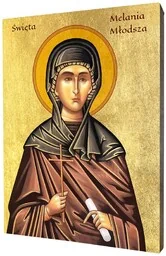 Ikona świętej Melanii MłodszejIkona świętej Melanii Młodszej wykonana na desce lipowej, podwójnie gruntowanej oraz uszlachetnionej płatkami pozłoty. Wizerunek świętej Melanii został naniesiony przy użyciu specjalnej techniki druku bezpośrednio na deskę. Święta Melania MłodszaUrodziła się w 383 r. w Rzymie jako córka senatora Waleriusza Publicoli; ród ten należał do najznamienitszych w Rzymie. W wieku 13 lat wyszła za mąż za swego kuzyna, Waleriusza Piniano.