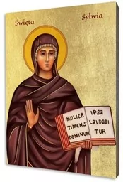 Ikona świętej Sylwii Ikona świętej Sylwii wykonana na desce lipowej, podwójnie gruntowanej oraz uszlachetnionej płatkami pozłoty. Grafika ikony świętej Sylwii został naniesiony przy użyciu specjalnej techniki druku bezpośrednio na deskę. Ikona z tyłu posiada certyfikat naszej firmy wraz z rokiem produkcji oraz zawieszkę typu krokodyl i jest gotowa do zawieszenia; dostępna jest w pięciu rozmiarach; grafika dostosowywana jest do formatu deski przez co może nieznacznie różnić się od zdjęcia produktu: 10x15 cm 15x20 cm 20x25 cm 30x40 cm 40x50 cm Nie stosujemy produkcji masowej. Ikony powstają w chwili złożenia zamówienia, a każdego Klienta traktujemy indywidualnie.