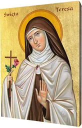 Ikona świętej TeresyIkona świętej Teresy wykonana na desce lipowej, podwójnie gruntowanej oraz uszlachetnionej płatkami pozłoty. Wizerunek św. Teresy został naniesiony przy użyciu specjalnej techniki druku bezpośrednio na deskę. Święta Teresa to patronka zakonów karmelitanek, karmelitanek Dzieciątka Jezus oraz terezjanek. Ikona z tyłu posiada certyfikat naszej firmy wraz z rokiem produkcji oraz zawieszkę typu krokodyl i jest gotowa do zawieszenia; dostępna jest w pięciu rozmiarach; grafika dostosowywana jest do formatu deski przez co może nieznacznie różnić się od zdjęcia produktu: