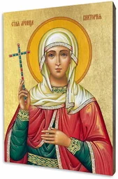 Ikona świętej Wiktorii Ikona świętej Wiktorii wykonana na desce lipowej, podwójnie gruntowanej oraz uszlachetnionej płatkami pozłoty. Grafika ikony świętej Wiktorii został naniesiony przy użyciu specjalnej techniki druku bezpośrednio na deskę. Ikona z tyłu posiada certyfikat naszej firmy wraz z rokiem produkcji oraz zawieszkę typu krokodyl i jest gotowa do zawieszenia; dostępna jest w pięciu rozmiarach; grafika dostosowywana jest do formatu deski przez co może nieznacznie różnić się od zdjęcia produktu: 10x15 cm 15x20 cm 20x25 cm 30x40 cm 40x50 cm Nie stosujemy produkcji masowej. Ikony powstają w chwili złożenia zamówienia, a każdego Klienta traktujemy indywidualnie.