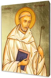 Ikona Święty Bernard - Inspiracja mądrością i duchowością Ikona przedstawiająca Świętego Bernarda jest hołdem dla jednego z najbardziej wpływowych świętych Kościoła katolickiego. Święty Bernard z Clairvaux, znany z głębokiej duchowości, mądrości teologicznej i oddania Bogu, jest postacią, która inspiruje do modlitwy i refleksji. Na ikonie widzimy Świętego Bernarda w jego charakterystycznym habicie cysterskim, z księgą i pastorałem w dłoniach, co symbolizuje jego rolę jako opata i nauczyciela. Ręcznie wykonana ikona - połączenie tradycji z najwyższą jakością Nasza ikona Święty Bernard została wykonana z dbałością o najdrobniejsze szczegóły. Powierzchnia jest ręcznie złocona szlagmetalem, co dodaje obrazowi blasku i elegancji.