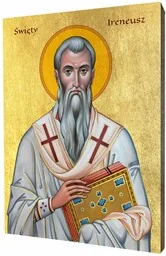 Ikona święty Ireneusz z LyonuIkona świętego Ireneusza wykonana na desce lipowej, podwójnie gruntowanej oraz uszlachetnionej płatkami pozłoty. Wizerunek św. Ireneusza został naniesiony przy użyciu specjalnej techniki druku bezpośrednio na deskę. Ireneusz z Lyonu biskup Vienne, teolog, apologeta, ojciec i Doktor Kościoła, męczennik chrześcijański, święty Kościoła katolickiego i prawosławnego. Ikona z tyłu posiada certyfikat naszej firmy wraz z rokiem produkcji oraz zawieszkę typu krokodyl i jest gotowa do zawieszenia; dostępna jest w pięciu rozmiarach; grafika dostosowywana jest do formatu deski przez co może nieznacznie różnić się od zdjęcia produktu: