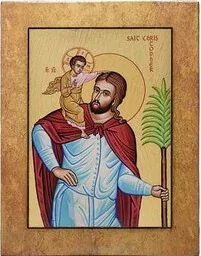 Ikona Święty KrzysztofRęcznie wykonana ikona drewniana (wykonana techniką własną) zapakowana w celofanowy woreczek. Ikona zabezpieczona jest stosownymi preparatami zapobiegającymi jej deformacji w pomieszczeniach o różnych temperaturach i wilgotności. Wymiary: 13 x 17 cmGrubość deski: ok. 17-20 mm