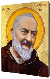 Ikona święty Ojciec PioIkona świętego Ojca Pio wykonana na desce lipowej, podwójnie gruntowanej oraz uszlachetnionej płatkami pozłoty. Wizerunek świętego Ojca Pio został naniesiony przy użyciu specjalnej techniki druku bezpośrednio na deskę. Ikona z tyłu posiada certyfikat naszej firmy wraz z rokiem produkcji oraz zawieszkę typu krokodyl i jest gotowa do zawieszenia; dostępna jest w pięciu rozmiarach; grafika dostosowywana jest do formatu deski przez co może nieznacznie różnić się od zdjęcia produktu: 10x15 cm15x20 cm20x25 cm30x40 cm40x50 cmNie stosujemy produkcji masowej. Ikony powstają w chwili złożenia zamówienia, a każdego Klienta traktujemy indywidualnie.