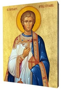 Ikona święty Szczepan Ikona z wizerunkiem św. Szczepana wykonana na desce lipowej, podwójnie gruntowanej oraz uszlachetnionej płatkami pozłoty. Wizerunek św. Szczepana został naniesiony przy użyciu specjalnej techniki druku bezpośrednio na deskę. Święty Szczepan Szczepan I Męczennik - pierwszy męczennik chrześcijański pochodzący z diaspory żydowskiej; był ścigany przez Sanhedryn i ukamienowany za głoszenie chrześcijaństwa w Jerozolimie około 33-36 roku.