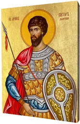 Ikona święty WiktorIkona z wizerunkiem św. Wiktora wykonana na desce lipowej, podwójnie gruntowanej oraz uszlachetnionej płatkami pozłoty. Wizerunek św. Wiktora został naniesiony przy użyciu specjalnej techniki druku bezpośrednio na deskę. Święty WiktorWiktor z Mediolanu, również Wiktor Afrykańczyk, wł.