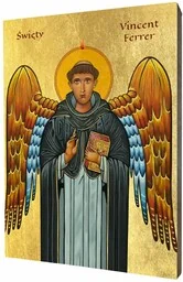 Ikona święty Wincenty FerreriuszIkona świętego Wincentego wykonana na desce lipowej, podwójnie gruntowanej oraz uszlachetnionej płatkami pozłoty. Wizerunek św. Wincentego został naniesiony przy użyciu specjalnej techniki druku bezpośrednio na deskę. Św. Wincenty Ferreriusz, org. Vincent FerrerHiszpański dominikanin, święty Kościoła katolickiego.