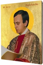 Ikona z błogosławionym ks. Jerzym PopiełuszkoIkona z błogosławionym ks. Jerzym Popiełuszko wykonana na desce lipowej, podwójnie gruntowanej oraz uszlachetnionej płatkami pozłoty. Wizerunek ks. Jerzego Popiełuszko został naniesiony przy użyciu specjalnej techniki druku bezpośrednio na deskę.