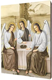 Ikona z Trójcą Świętą według RublowaIkona z Trójcą Świętą według Rublowa wykonana na desce lipowej, podwójnie gruntowanej oraz uszlachetnionej płatkami pozłoty. Wizerunek Trójcy Świętej zostało naniesione przy użyciu specjalnej techniki druku bezpośrednio na deskę. Trójca Święta według RublowaPostaci siedzące przy stole symbolizują Trójcę Świętą, ale wbrew zwyczajowi osoby znajdujące się na ikonie nie są podpisane. W identyfikacji mają pomagać symbole. Postać środkowa jest zwykle utożsamiana z Synem Bożym.
