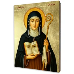 Ikona złocona, święta Otylia Ikona świętej Otylii pozłacany wizerunek patronki wzroku i duchowego światła na drewnie lipowym Ikona świętej Otylii przedstawia jedną z najbardziej czczonych świętych chrześcijaństwa zachodniego, znaną jako patronka wzroku, uzdrowienia i wewnętrznej jasności duchowej. Święta ukazana jest w stroju ksieni benedyktyńskiej, trzymająca pastorał oraz otwartą księgę, na której widoczny jest symbol oczu znak zarówno fizycznego widzenia, jak i duchowego poznania. Jej spokojna, pełna łagodności twarz emanuje mądrością, miłosierdziem i całkowitym zaufaniem Bogu. Złote tło ikony podkreśla świętość postaci i obecność Bożego światła. Kim była święta Otylia i dlaczego ikona ma głębokie znaczenie Święta Otylia żyła w VII wieku w Alzacji i według tradycji urodziła się niewidoma, odzyskując wzrok w momencie chrztu.