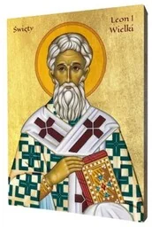 Trwałość i Głębia Kolorów Dzięki specjalnej technice nanoszenia obrazu, kolory pozostają intensywne i odporne na blaknięcie, co zapewnia długowieczność ikony. Ochrona Werniksem Warstwa werniksu dodaje połysku i chroni ikonę przed wilgocią oraz innymi czynnikami zewnętrznymi. Kim Był Święty Leon I Wielki? Święty Leon I Wielki to jeden z najbardziej wpływowych papieży w historii Kościoła katolickiego. Bronił doktryny chrześcijańskiej przed herezjami i wspierał jedność Kościoła. Jego pisma teologiczne i homilie miały ogromny wpływ na rozwój doktryny katolickiej.