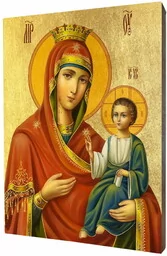 Iwerska ikona Matki BożejIwerska ikona Matki Bożej wykonana na desce lipowej, podwójnie gruntowanej oraz uszlachetnionej płatkami pozłoty. Wizerunek Matki Bożej został naniesiony przy użyciu specjalnej techniki druku bezpośrednio na deskę. To cudowna ikona Matki Bożej, reprezentująca typ Hodegetria. Jedna z najbardziej znanych i czczonych ikon, posiadająca szereg również uznanych cudownych kopii. Jej oryginał znajduje się w monasterze Iwiron na górze Athos, od którego wzięła swoją nazwę.