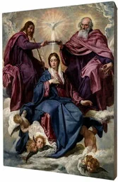 Obraz religijny na desce lipowej, Koronacja Matki BożejObraz religijny Koronacja Matki Bożej, wykonany na lipowej desce, klejonej. Deska do obrazu została odpowiednio przygotowana, zagruntowana oraz pomalowana emalią satynową dzięki czemu nie straci swoich walorów przez długie lata. Obraz z Matką Bożą naniesiony jest dzięki zaawansowanej technice druku bezpośrednio na deskę co gwarantuje wyjątkowo nasycone kolory reprodukcji oraz trwałość co najmniej 100 lat. Obraz na desce dodatkowo został polakierowany na froncie dzięki czemu można go przecierać wilgotną ściereczką. Obraz z tyłu posiada certyfikat naszej firmy wraz z rokiem produkcji oraz zawieszkę typu krokodyl i jest gotowy do zawieszenia.
