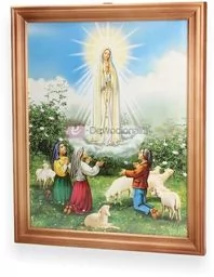 Obraz sakralny z motywem Matki Boskiej Fatimskiej Obraz wykonany w drewnianej ramie z szybką. Pasuje na każdą ścianę. Produkt Polski! Wysokość: 27 cm Szerokość: 23 cm