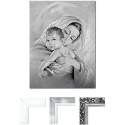 Obraz Matka Boża z Dzieciątkiem Jezus Obraz religijny przedstawia Najświętszą Marię Pannę przytulającą swojego Syna, Jezusa Chrystusa. W powyższym obrazie zastosowano stonowaną gamę kolorystyczną, podkreśloną ostrym zarysem konturów i szczegółów. To połączenie wspaniale oddaje jednoczesną delikatność i subtelność Matki Bożej wraz z jej silną miłością do Syna. Dzięki zastosowaniu wysokiej jakości urządzeń drukujących wizerunek charakteryzuje się wspaniałą kolorystyką i wyrazistością, które podkreślają nastrój panujący w obrazie. Obraz religijny dostępny w trzech rozmiarach:
