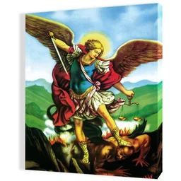 Obraz religijny na płótnie Archanioł Michał Obraz religijny na wysokiej jakości płótnie przedstawia wizerunek Michała Archanioła. W religii chrześcijańskiej jeden z archaniołów, święty Kościoła katolickiego i prawosławnego. Według tradycji chrześcijańskiej i żydowskiej, kiedy Lucyfer zbuntował się przeciwko Bogu i nakłonił do buntu 1/3 aniołów, Michał miał wystąpić jako pierwszy przeciwko niemu. Wstawia się u Boga za ludźmi, jest aniołem stróżem ludu chrześcijańskiego. Stoi u wezgłowia umierających, którym następnie towarzyszy w drodze do wieczności.