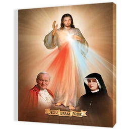 Obraz religijny na płótnie Jezus Miłosierny, Święty Jan Paweł II i Siostra Faustyna Obraz religijny na wysokiej jakości płótnie przedstawia wizerunek Jezusa Miłosiernego, Świętego Jana Pawła II i Świętej Siostry Faustyny. Produkt dostępny w czterech rozmiarach: 30x40cm, 35x50cm, 40x60cm, 50x70cm. Obrazy Świętej Rodziny, Świętej Rity, Świętej Faustyny i wiele innych wizerunków Obrazy religijne to wspaniałej jakości dzieła sakralne, przedstawiające różnego rodzaju sceny powiązane z Biblią oraz wizerunki Świętej Rodziny i Świętych i Błogosławionych. Dostępne w naszej ofercie obrazy religijne na płótnie cechują się estetycznym wykonaniem, wspaniałą gamą kolorystyczną, ostrością detali i wyjątkową kompozycją.