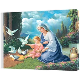 Obraz religijny na płótnie Matka Boża z Dzieciątkiem Jezus i gołąbkami Obraz religijny na wysokiej jakości płótnie przedstawia wizerunek Najświętszej Maryi Panny z Dzieciątkiem Jezus i gołąbkami. Produkt dostępny w czterech rozmiarach: 30x40cm, 35x50cm, 40x60cm, 50x70cm. Obrazy Świętej Rodziny, Świętej Rity, Świętej Faustyny i wiele innych wizerunków Obrazy religijne to wspaniałej jakości dzieła sakralne, przedstawiające różnego rodzaju sceny powiązane z Biblią oraz wizerunki Świętej Rodziny i Świętych i Błogosławionych. Dostępne w naszej ofercie obrazy religijne na płótnie cechują się estetycznym wykonaniem, wspaniałą gamą kolorystyczną, ostrością detali i wyjątkową kompozycją.