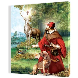 Obraz religijny na płótnie Święty Hubert Obraz religijny na wysokiej jakości płótnie przedstawia wizerunek Świętego Huberta. Biskup Liège w Belgii, święty Kościoła katolickiego, apostoł Ardenów. Hubert urodził się w 655 r. w Gaskonii. Najwięcej czasu spędzał w lasach, gdzie nieustannie polował; łowiectwo było jego pasją.