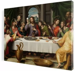 Obraz religijny Ostatnia Wieczerza, płótno canvas Obraz religijny na płótnie typu canvas przedstawiający scenę Ostatniej Wieczerzy. Obraz religijny na płótnie z Ostatnią Wieczerzą może stanowić doskonały prezent, z pewnością wniesie do pomieszczenia ciepło i kolor a także może być pomocą w codziennej modlitwie. Nasze obrazy religijne na płótnie Nie stosujemy produkcji masowej. Obrazy powstają w chwili złożenia zamówienia, a każdego Klienta traktujemy indywidualnie. Gwarantuje to produkt na najwyższym poziomie i doskonałą jakość obsługi.