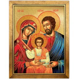 Obraz złocony w ramie, Święta Rodzina Obraz złocony w ramie z wizerunkiem Świętej Rodziny. Produkt wykonany z najwyższej jakości materiałów. Drewniana płyta obrazu jest ręcznie złocona szlagmetalem. Wizerunek nanoszony jest za pomocą specjalistycznych urządzeń, które zapewniają trwałość i wysoką jakość obrazu przez wiele lat. Wizerunek ozdobiony piękną i elegancką rama w kolorze starego złota.