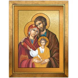 Obraz złocony w ramie, Święta Rodzina Obraz złocony w ramie z wizerunkiem Świętej Rodziny. Produkt wykonany z najwyższej jakości materiałów. Drewniana płyta obrazu jest ręcznie złocona szlagmetalem. Wizerunek nanoszony jest za pomocą specjalistycznych urządzeń, które zapewniają trwałość i wysoką jakość obrazu przez wiele lat. Wizerunek ozdobiony piękną i elegancką rama w kolorze starego złota.