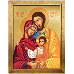 Obraz złocony w ramie, Święta Rodzina Obraz złocony w ramie z wizerunkiem Świętej Rodziny. Produkt wykonany z najwyższej jakości materiałów. Drewniana płyta obrazu jest ręcznie złocona szlagmetalem. Wizerunek nanoszony jest za pomocą specjalistycznych urządzeń, które zapewniają trwałość i wysoką jakość obrazu przez wiele lat. Wizerunek ozdobiony piękną i elegancką rama w kolorze starego złota.