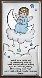 Obrazek srebrny z wizerunkiem Aniołka na chmurce w niebieskiej kolorystyce Na obrazku modlitwa "Aniele Boży, stróżu mój. . . " W produkcji obrazka wykorzystano innowacyjny metal szlachetny o nazwie MIRO-SILVER , który został pokryty warstwą czystego srebra o próbie 999,95 w procesie technologicznym opartym na metodzie PVD (fizyczne osadzanie z fazy gazowej) Drogocenny metal posiada wyjątkowe cechy, przewyższając jakością materiały pozyskiwane metodami tradycyjnymi. Jest odporniejszy na odkształcenia mechaniczne i śniedzenie, doskonale odbija światło, co podkreśla szlachetność srebra. Całość została wyprodukowana we Włoszech przez firmę DONO , zgodnie z kunsztem i tradycją obróbki metali szlachetnych. W obrazku elegancka nóżka aby móc postawić obrazek oraz otwór do powieszenia.