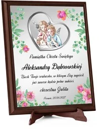 Obrazek z życzeniami i decykacją na pamiątkę chrztu Obrazek z życzeniami i dedykacją to wyjątkowy sposób na uczczenie ważnych chwil, takich jak Chrzest Święty . Elegancka forma, trwałość wykonania i starannie dobrane detale sprawią. że ten niepowtarzalny prezent zyska szczególne miejsce w sercu obdarowanego. Drewniany podkład w kolorze ciemnego brązu podkreśla ponadczasowy charakter, a nadruk z dedykacją na aluminiowej płycie gwarantuje jego trwałość i estetykę . Obrazek święty z motywem aniołka i lustrzanym efektem dodaje blasku i harmonijnie komponuje się z każdym wnętrzem.
