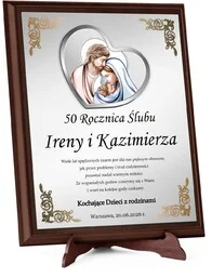 Obrazek z życzeniami i decykacją na rocznicę od dzieci Obrazek z życzeniami i dedykacją to wyjątkowy sposób na uczczenie ważnych chwil, takich jak rocznica ślubu . Elegancka forma, trwałość wykonania i starannie dobrane detale sprawią. że ten niepowtarzalny prezent zyska szczególne miejsce w sercu obdarowanego. Drewniany podkład w kolorze ciemnego brązu podkreśla ponadczasowy charakter, a nadruk z dedykacją na aluminiowej płycie gwarantuje jego trwałość i estetykę . Obrazek święty z motywem rodziny świętej i lustrzanym efektem dodaje blasku i harmonijnie komponuje się z każdym wnętrzem.