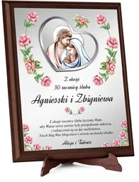 Obrazek z życzeniami i decykacją na 30 rocznicę ślubu Obrazek z życzeniami i dedykacją to wyjątkowy sposób na uczczenie ważnych chwil, takich jak rocznica ślubu . Elegancka forma, trwałość wykonania i starannie dobrane detale sprawią. że ten niepowtarzalny prezent zyska szczególne miejsce w sercu obdarowanego. Drewniany podkład w kolorze ciemnego brązu podkreśla ponadczasowy charakter, a nadruk z dedykacją na aluminiowej płycie gwarantuje jego trwałość i estetykę . Obrazek z motywem rodziny świętej i lustrzanym efektem dodaje blasku i harmonijnie komponuje się z każdym wnętrzem.