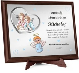 Obrazek z życzeniami i decykacją na chrzest święty Obrazek z życzeniami i dedykacją to wyjątkowy sposób na uczczenie ważnych chwil, takich jak Chrzest . Elegancka forma, trwałość wykonania i starannie dobrane detale sprawią. że ten niepowtarzalny prezent zyska szczególne miejsce w sercu obdarowanego. Drewniany podkład w kolorze ciemnego brązu podkreśla ponadczasowy charakter, a nadruk z dedykacją na aluminiowej płycie gwarantuje jego trwałość i estetykę . Obrazek z motywem anioła stróża i lustrzanym efektem dodaje blasku i harmonijnie komponuje się z każdym wnętrzem.