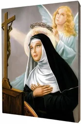 Obraz religijny na desce lipowej, święta Rita z CasciiObraz religijny przedstawiający świętą Ritę z Cascii wykonany na lipowej desce, klejonej. Deska do obrazu została odpowiednio przygotowana, zagruntowana oraz pomalowana emalią satynową dzięki czemu nie straci swoich walorów przez długie lata. Obraz świętej Rity naniesiony jest dzięki zaawansowanej technice druku bezpośrednio na deskę co gwarantuje wyjątkowo nasycone kolory reprodukcji oraz trwałość co najmniej 100 lat. Obraz na desce dodatkowo został polakierowany na froncie dzięki czemu można go przecierać wilgotną ściereczką. Obraz z tyłu posiada certyfikat naszej firmy wraz z rokiem produkcji oraz zawieszkę typu krokodyl i jest gotowy do zawieszenia.