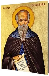 Święty Benedykt, ikona religijnaIkona religijna świętego Benedykta wykonana na desce lipowej, podwójnie gruntowanej oraz uszlachetnionej płatkami pozłoty. Wizerunek świętego Benedykta został naniesiony przy użyciu specjalnej techniki druku bezpośrednio na deskę. Ikona z tyłu posiada certyfikat naszej firmy wraz z rokiem produkcji oraz zawieszkę typu krokodyl i jest gotowa do zawieszenia; dostępna jest w pięciu rozmiarach; grafika dostosowywana jest do formatu deski przez co może nieznacznie różnić się od zdjęcia produktu: 10x15 cm15x20 cm20x25 cm30x40 cm40x50 cmNie stosujemy produkcji masowej. Ikony powstają w chwili złożenia zamówienia, a każdego Klienta traktujemy indywidualnie.
