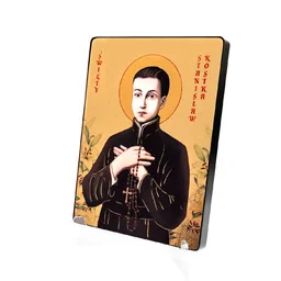 Święty Stanisław Kostka - ikona naklejana Na prezentowanej ikonie religijnej znajduje się wizerunek Świętego Stanisława Kostki. Ikona religijna naklejana - wyjątkowy podarunek za niewielkie pieniądze Produkt wykonany na starannie przygotowanej desce olchowej. Wizerunek znajdujący się na ikonie to wydruk na złotym kartonie dodatkowo zabezpieczony lakierem UV. Ikona religijna w wersji klejonej to doskonały wybór dla klientów ceniących wysoką jakość w atrakcyjnej cenie. Produkt wykonany z najwyższą starannością i dbałością o szczegóły.