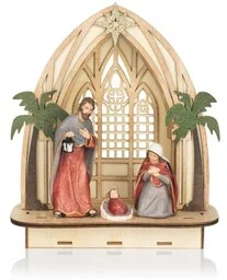 Sklejka Postacie: Święta Rodzina (Józef, Maryja, Dzieciątko Jezus) Elementy dekoracyjne: Palmy, gwiazda betlejemska Kolorystyka: Naturalna sklejka z delikatnie malowanymi postaciami w odcieniach czerwieni, szarości i brązu Oświetlenie LED Szopka wyposażona jest w łańcuch LED, który tworzy ciepłe i nastrojowe światło, idealne do wieczornego oświetlenia podczas świąt. Lampki LED podkreślają detale szopki, dodając jej uroku zarówno w dzień, jak i w nocy.