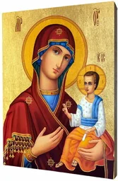 Wołyńska ikona Matki BożejWołyńska ikona Matki Bożej wykonana na desce lipowej, podwójnie gruntowanej oraz uszlachetnionej płatkami pozłoty. Wizerunek Matki Bożej Wołyńskiej został naniesiony przy użyciu specjalnej techniki druku bezpośrednio na deskę. Wołyńska Ikona Matki Bożej to ikona typu Hodegetria z początku XIV wieku, przechowywana przez wieki w cerkwi wstawienniczej w mieście Łuck. Jeden z najstarszych zabytków malarstwa zachowanych na zachodzie Ukrainy. Ikona z tyłu posiada certyfikat naszej firmy wraz z rokiem produkcji oraz zawieszkę i jest gotowa do zawieszenia; dostępna jest w pięciu rozmiarach; grafika dostosowywana jest do formatu deski przez co może nieznacznie różnić się od zdjęcia produktu: