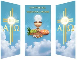 Zestaw 3 banerów na Boże Ciało Wysokiej jakości kompozycja banerów na Boże Ciało. Grafika znajdująca się na produktach charakteryzuje się ciepłym odcieniem, który idealnie uświetni uroczystość Bożego Ciała. W zestawie 2 boczne banery w rozmiarze 75x200 cm, baner środkowy w rozmiarze 100x200 cm. Nasze produkty wydrukowane są na najwyższej jakości materiale banerowym, który zapewnia odporność na wszelkiego rodzaju wymagające warunki atmosferyczne, dzięki czemu baner przeznaczony jest do ekspozycji wewnętrznej oraz zewnętrznej. Wymiary banerów: